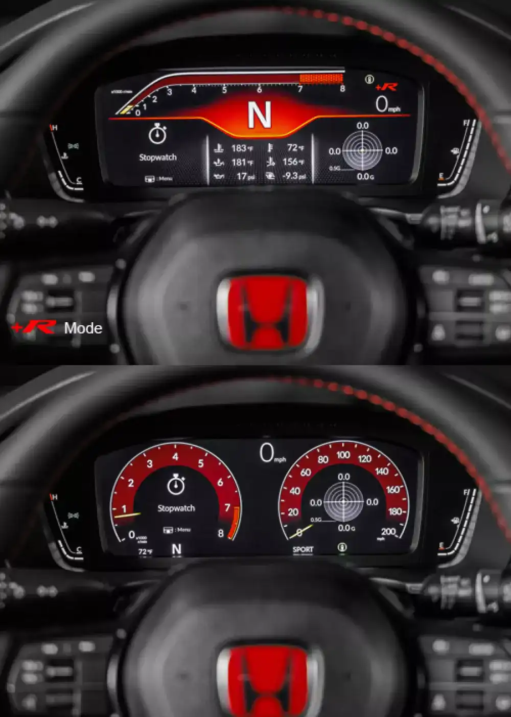 Tampilan layar yang eksklusif dengan sentuhan warna merah untuk +R mode dirancang untuk memberikan pengalaman berkendara yang lebih sporty saat Anda berada di dalam kabin. Layar ini dapat menampilkan beragam informasi sesuai dengan preferensi Anda, seperti suhu pada pendingin mesin, suhu pada oli mesin, steering angle, tekanan pada rem, yaw rate dan lainnya.