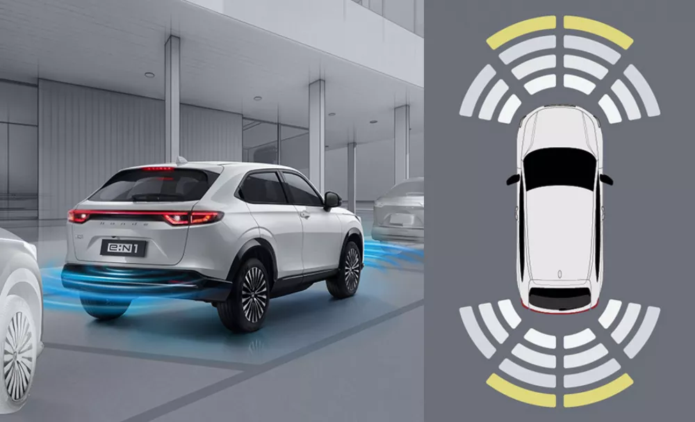 Honda e:N1 dilengkapi parking sensors 8-Position Parking Sensors, membantu mendeteksi objek di sekitar kendaraan untuk parkir lebih aman dan mudah.